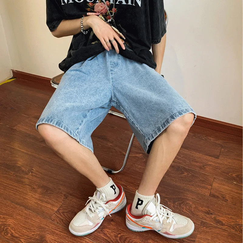 Summer Denim Shorts for Men Korean Harajuku Retro All-Match Baggy Straight Bottoms Wide-Leg High Street Five-Point Jeans Pants - Light Blue / M / VIP Price is backordered and will ship as soon as it is back in stock.
