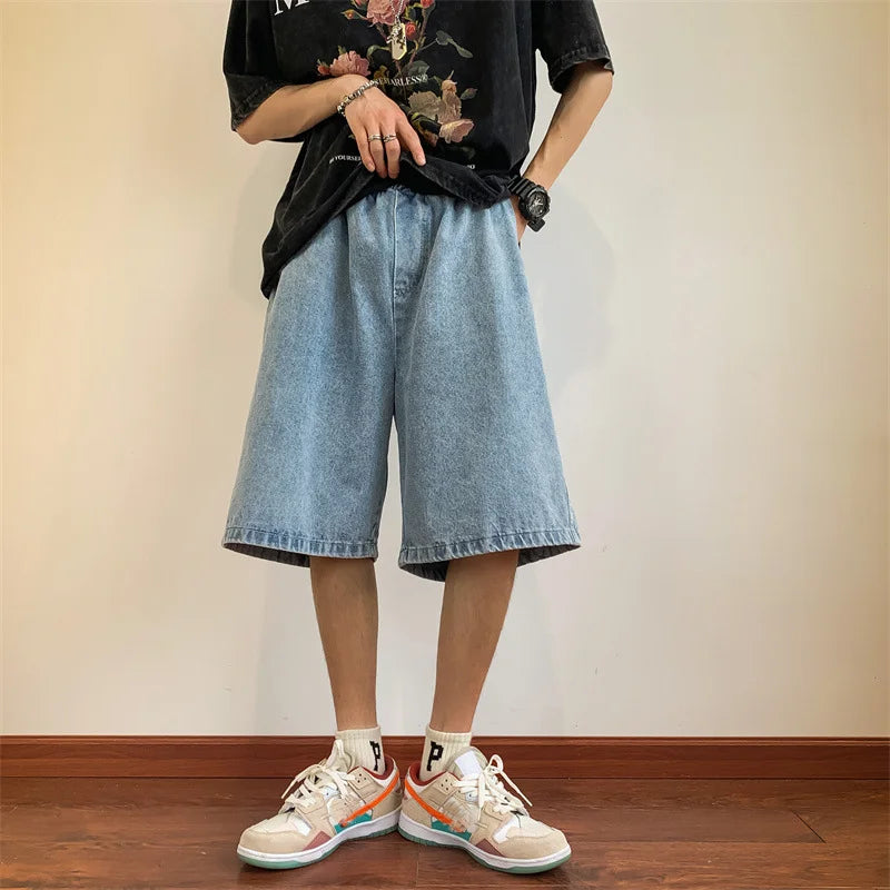 Summer Denim Shorts for Men Korean Harajuku Retro All-Match Baggy Straight Bottoms Wide-Leg High Street Five-Point Jeans Pants
