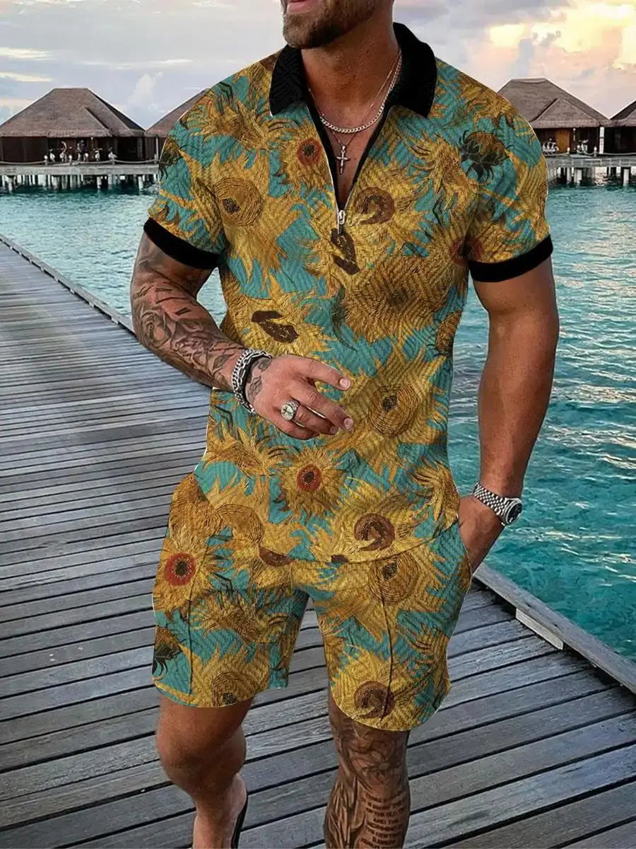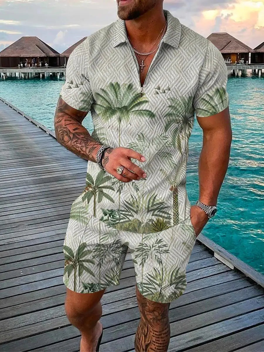 Hawaiian Polo Set Men Tracksuit Sets Summer 3D Beach Outfits Polo Shirt Shorts 2pcs Sets Zipper Coconut Tree Casual man Clothing