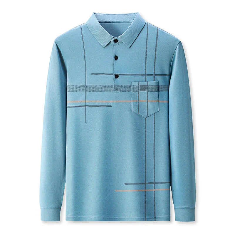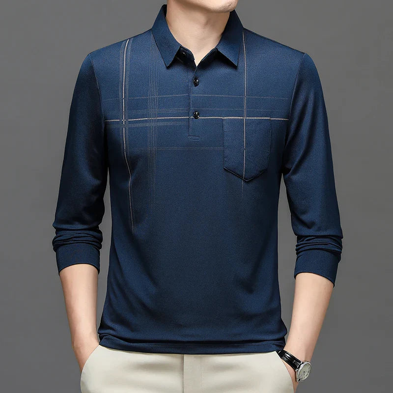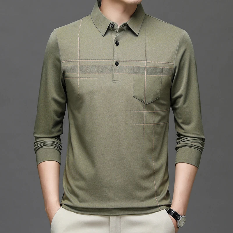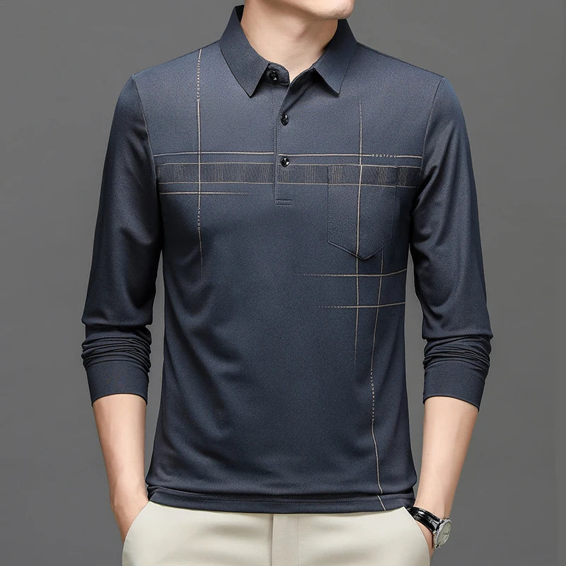 Spring Autumn Striped Business Polo Shirt Men's Long Sleeve Pullover T Shirt Turn-down Collar Tops