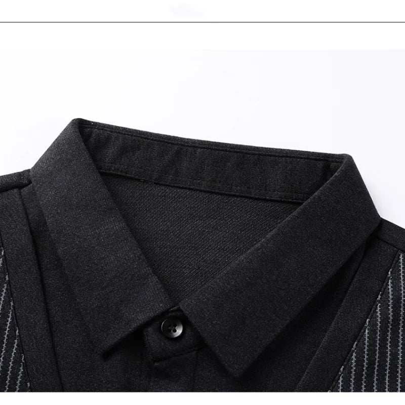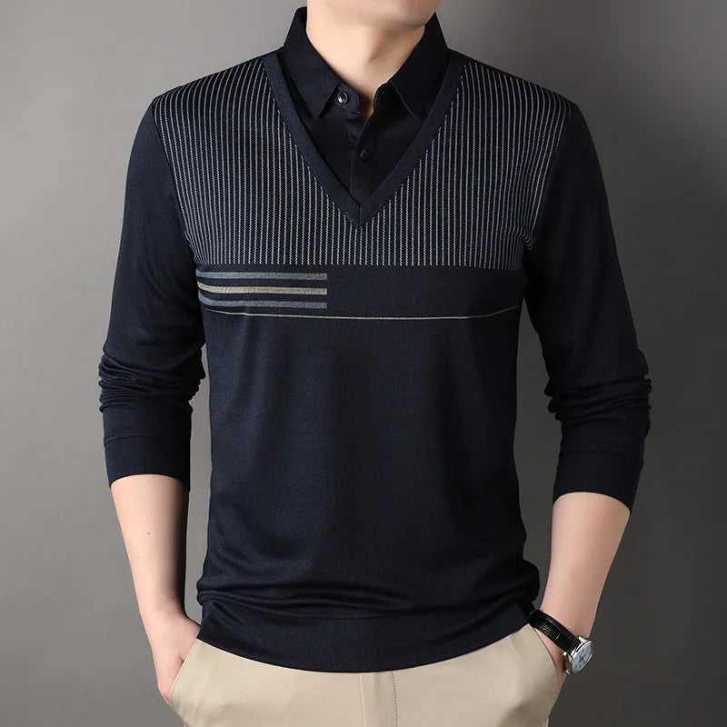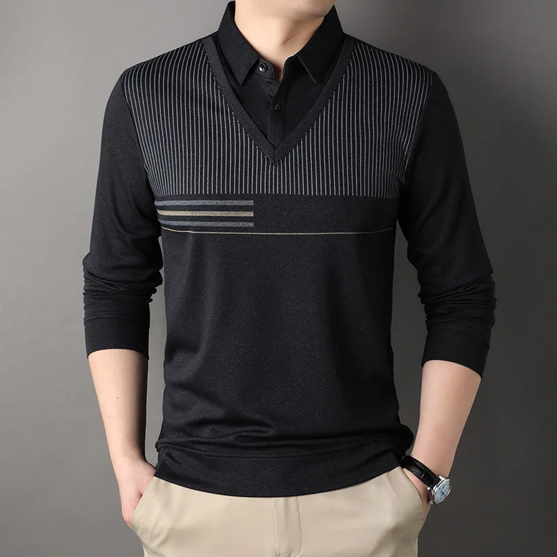 Spring and Autumn Men's Pullover Polo Collar Stripe Contrast Button Solid Fake Two Piece Long Sleeve T-shirt Polo Bottom Tops
